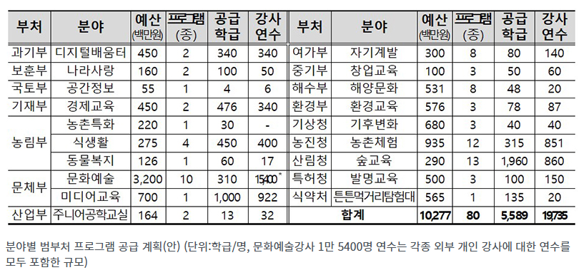 또한 지자체·대학에는 212억원을 투입해 지역 수요에 맞는 150종 이상의 프로그램을 개발한 후 6000개 이상의 학급에 프로그램을 제공하기로 했습니다.